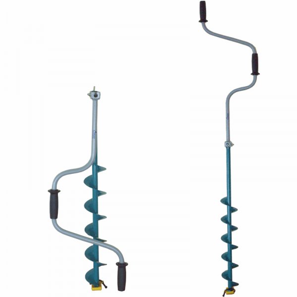 Основное и единственное отличие двуручных ледобуров от классических - верхняя рукоятка ледобура смещена относительно оси ледобура на 130 мм, а нижняя на 150 мм. Такое расположение рукояток позволяет вращать ледобур одновременно двумя руками, тем самым, увеличивая скорость бурения лунок во льду. Кроме того, существенно уменьшаются габариты ледобура в транспортном положении. По всем остальным характеристикам двуручные ледобуры полностью соответствуют классическим.